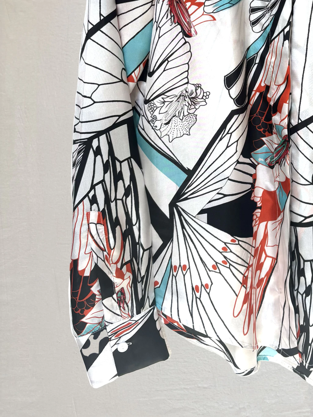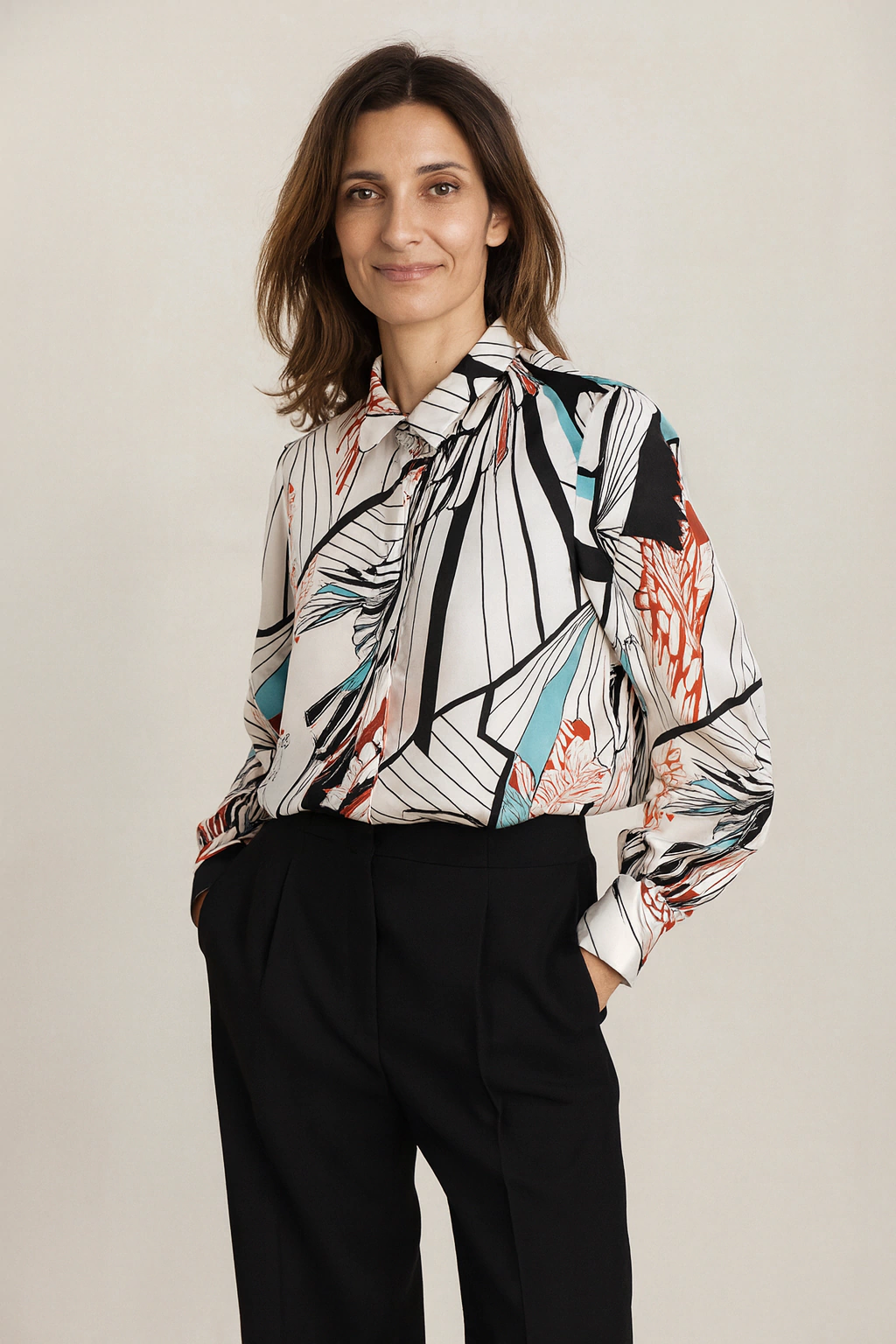 Camisa en pura seda natural con calce clásico y línea slim, liviana y suave al tacto. Su estampa exclusiva mezcla tonos rojos, negros y blanco en un diseño artístico que transmite movimiento y energía.