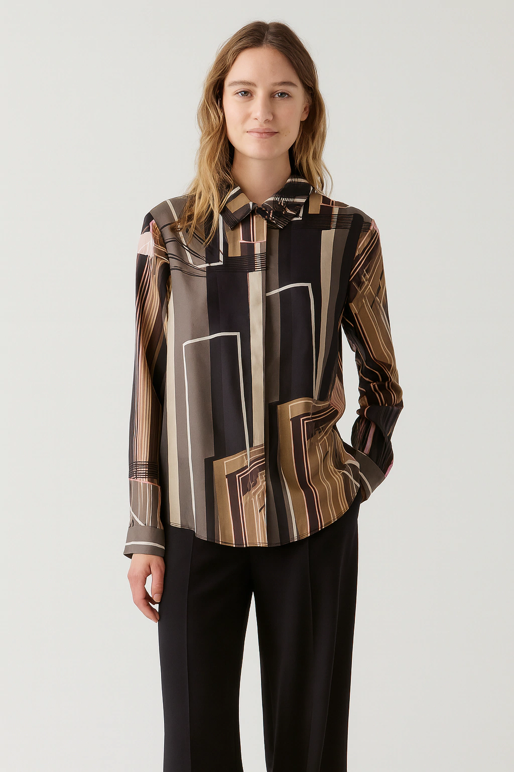 Camisa en pura seda natural con calce clásico y línea slim, liviana y suave al tacto. Su estampa exclusiva mezcla tonos chocolates, negros, avellana, cruso y un acento de rosa en un diseño geometrico que remite al arte MADÍ.