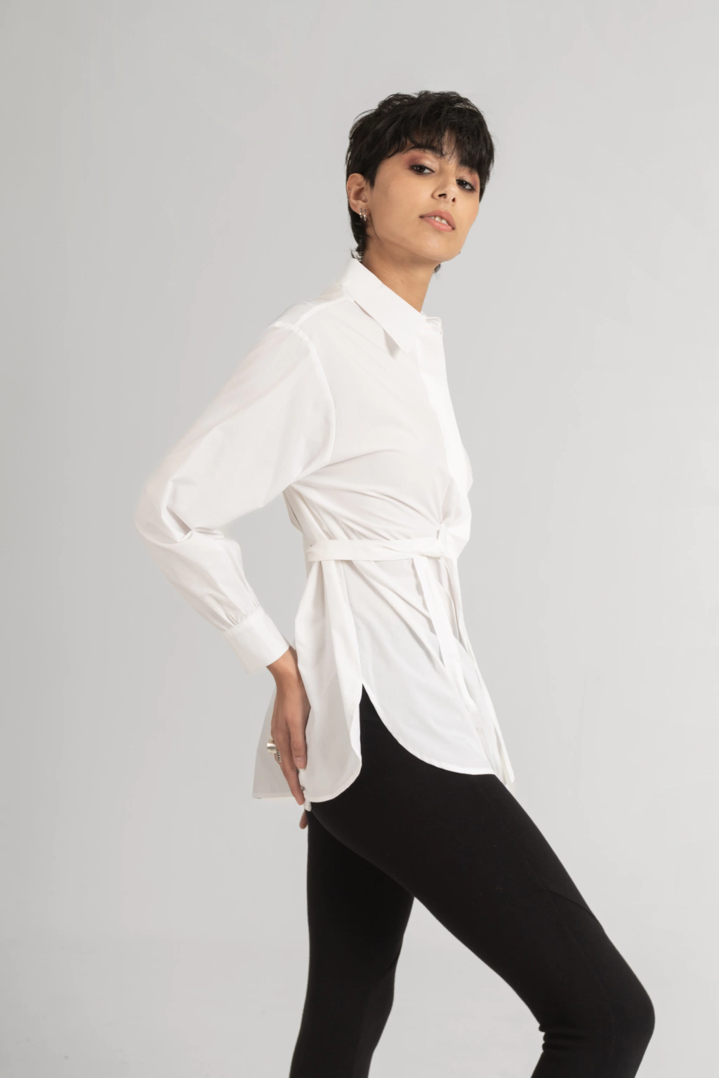 Camisa confeccionada en poplin ecológico certificado, realizado con fibras y procesos no abrasivos para el medio ambiente, en algodón y tencel. Silueta que enfatiza la cintura mediante pinzas y lazos que podes atar de diferentes maneras creando nuevas posibilidades de uso. Largo hasta la cadera y mangas con detalle de presilla en puño. Esta camisa va a ser sin duda la statement piece de tus looks esta temporada.