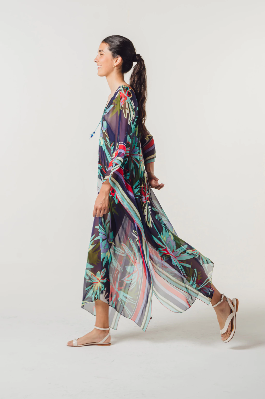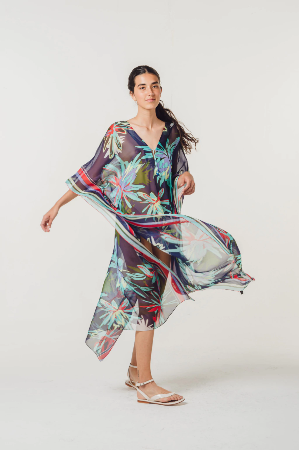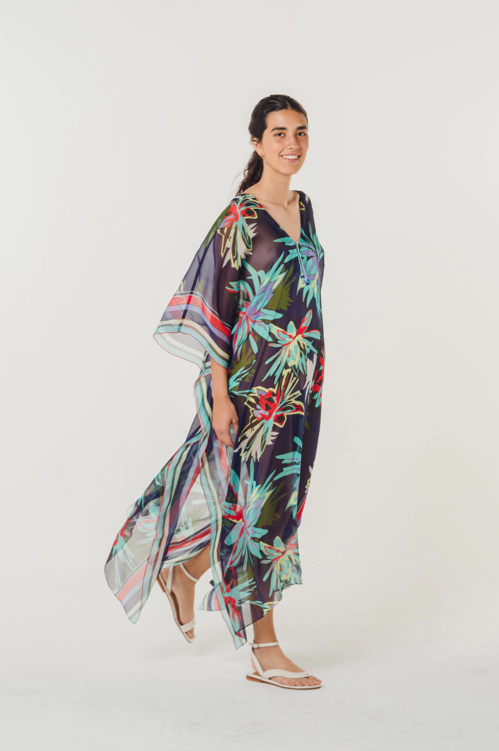 Chest & Hip contour: 135 cm. Lenght: 125 cm. Timeless floor-length kaftan crafted from exceptional light-weight pure silk chiffon. This beach party dress design celebrates nature with Bothanical elements pattern and the spirit of summer trips in the 50's between Acapulco and Hong Kong.