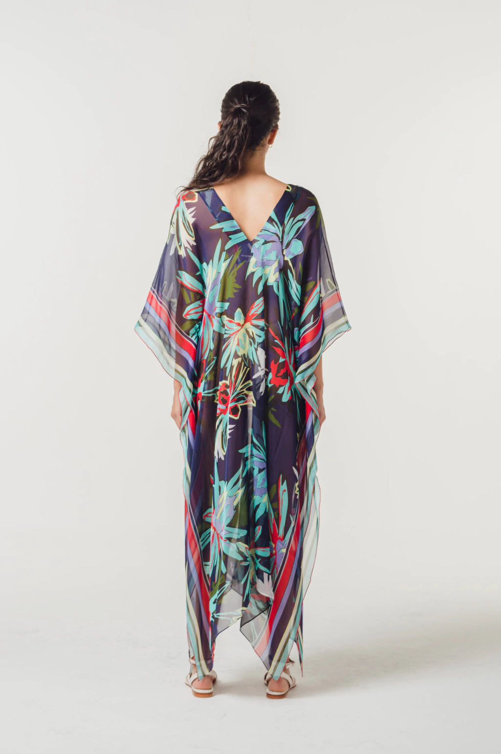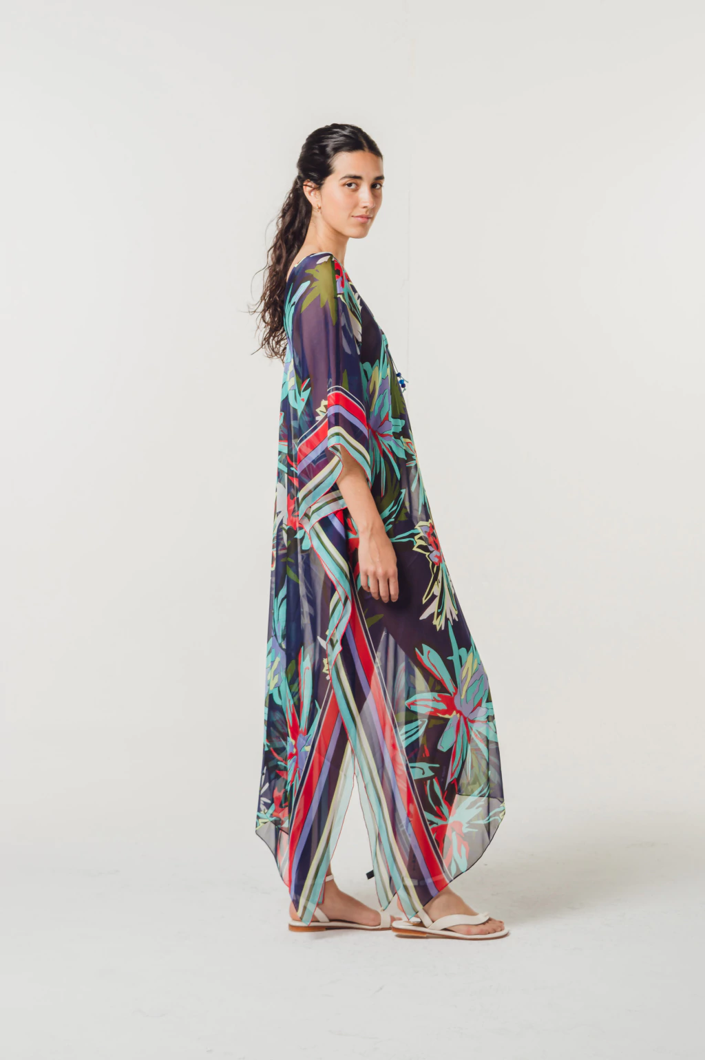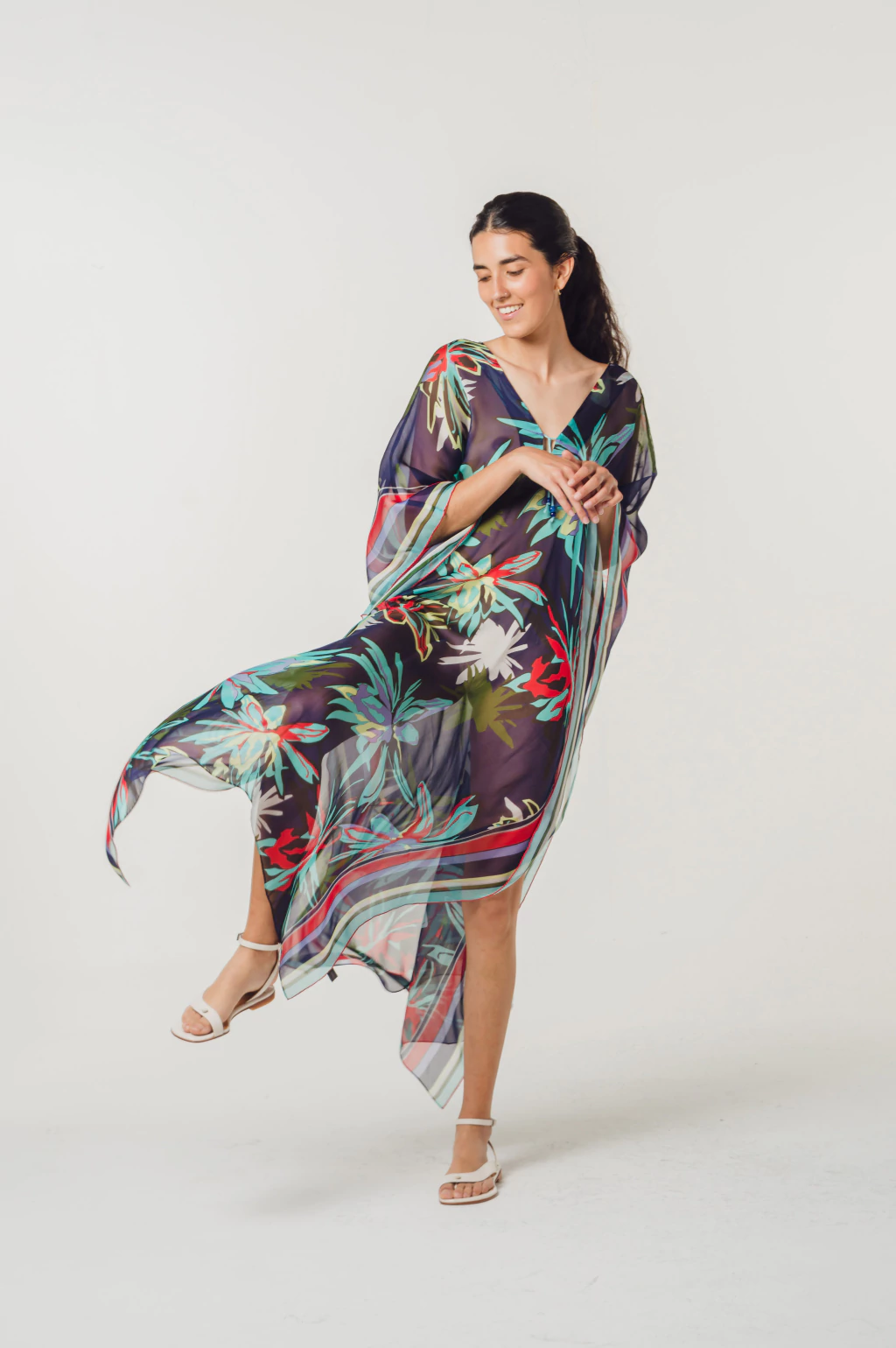 Chest & Hip contour: 135 cm. Lenght: 125 cm. Timeless floor-length kaftan crafted from exceptional light-weight pure silk chiffon. This beach party dress design celebrates nature with Bothanical elements pattern and the spirit of summer trips in the 50's between Acapulco and Hong Kong.