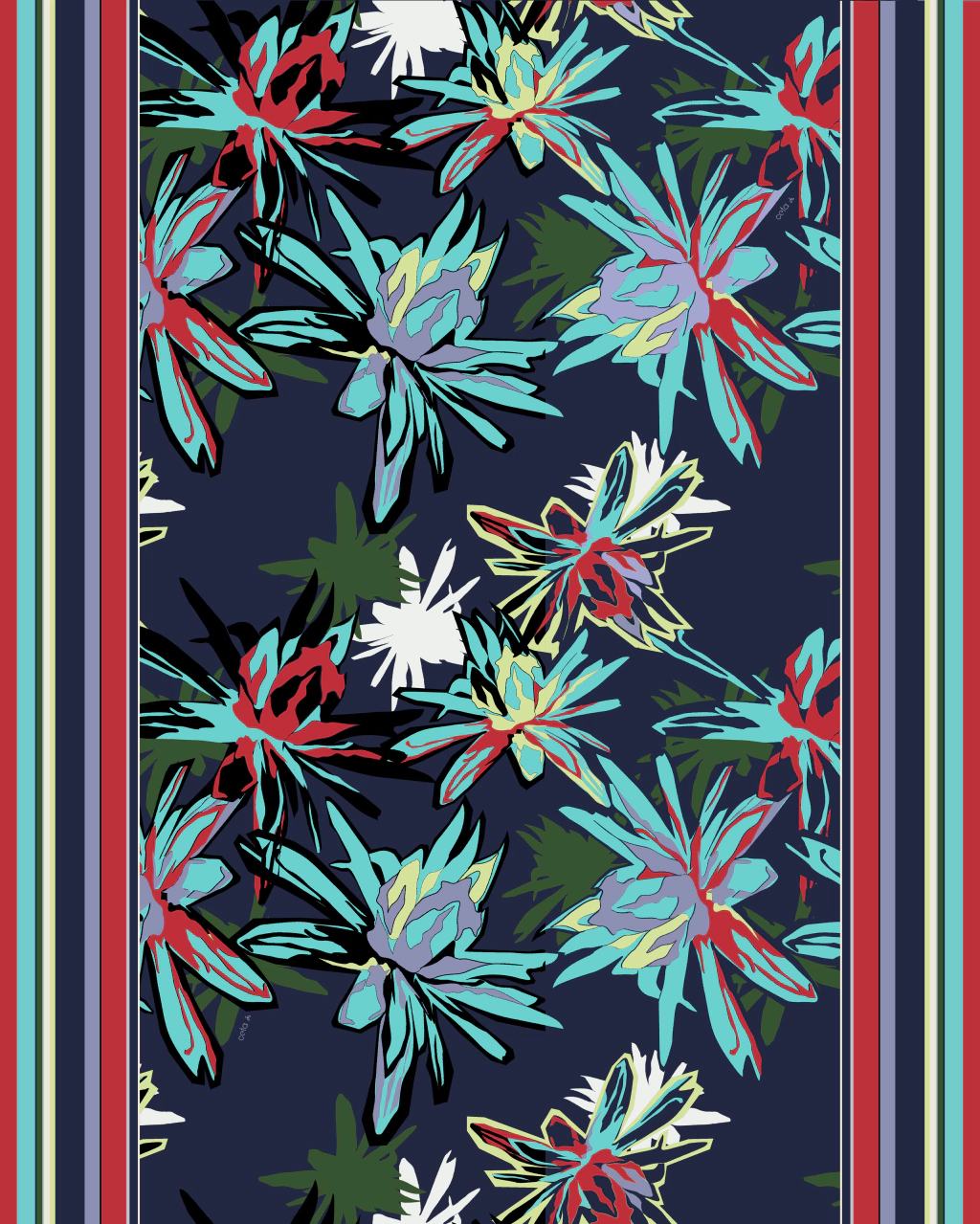 Este Kaftan esta inspirado en flores trabajadas desde el estilo Comic grafico y colores contrastantes. Una capsula pensada en viajes entre Acapulco y Hong Kong en los 50´s.